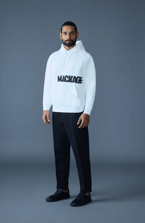 KRYSTIAN-PR is a classic hoodie crafted to a relaxed fit from double-face jersey. Large kangaroo pocket and rib knit trim add timeless styling. A relaxed layer-ready silhouette, a 'MACKAGE' logo is a screen printed at front. The perfect all-season indoor-outdoor staple.