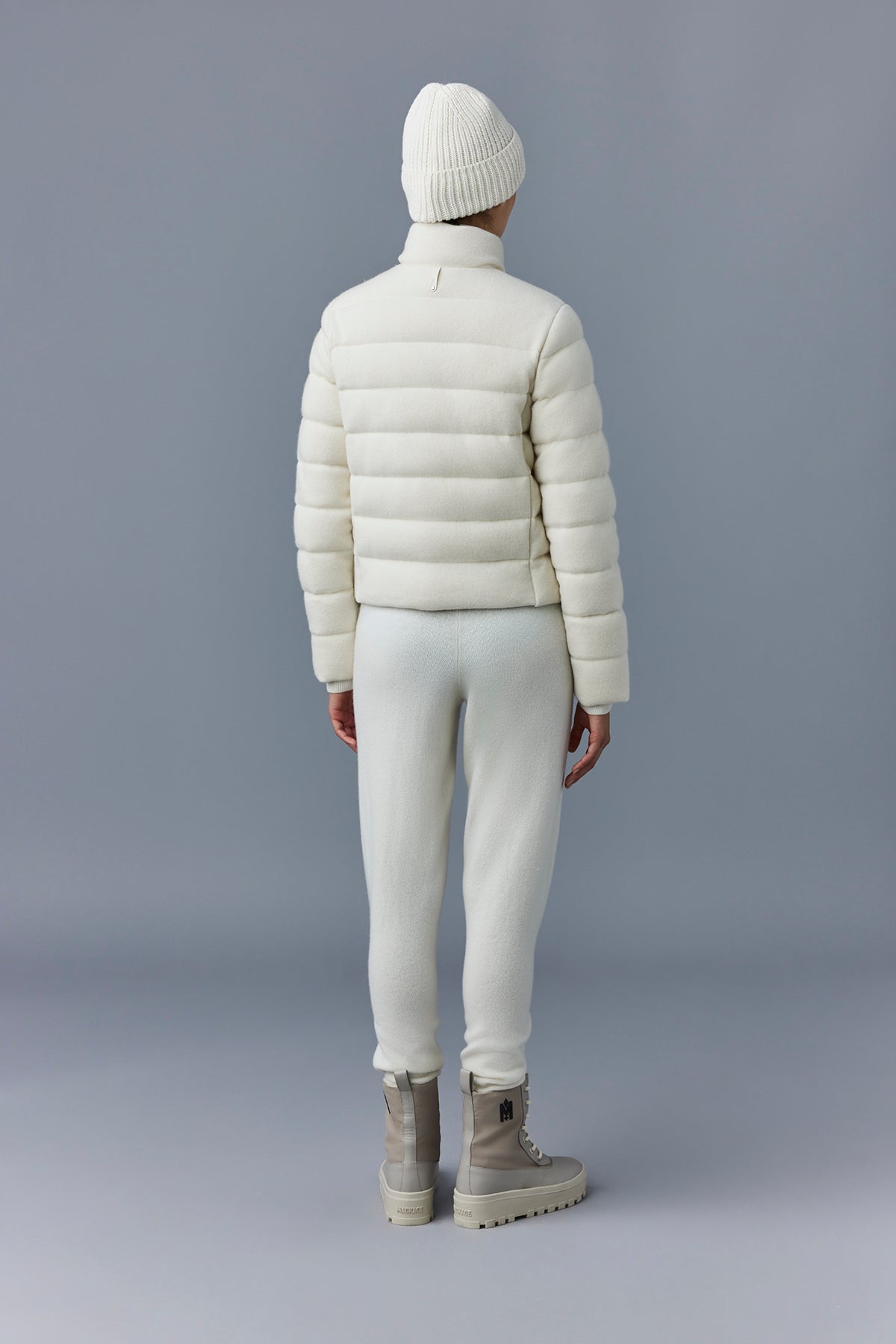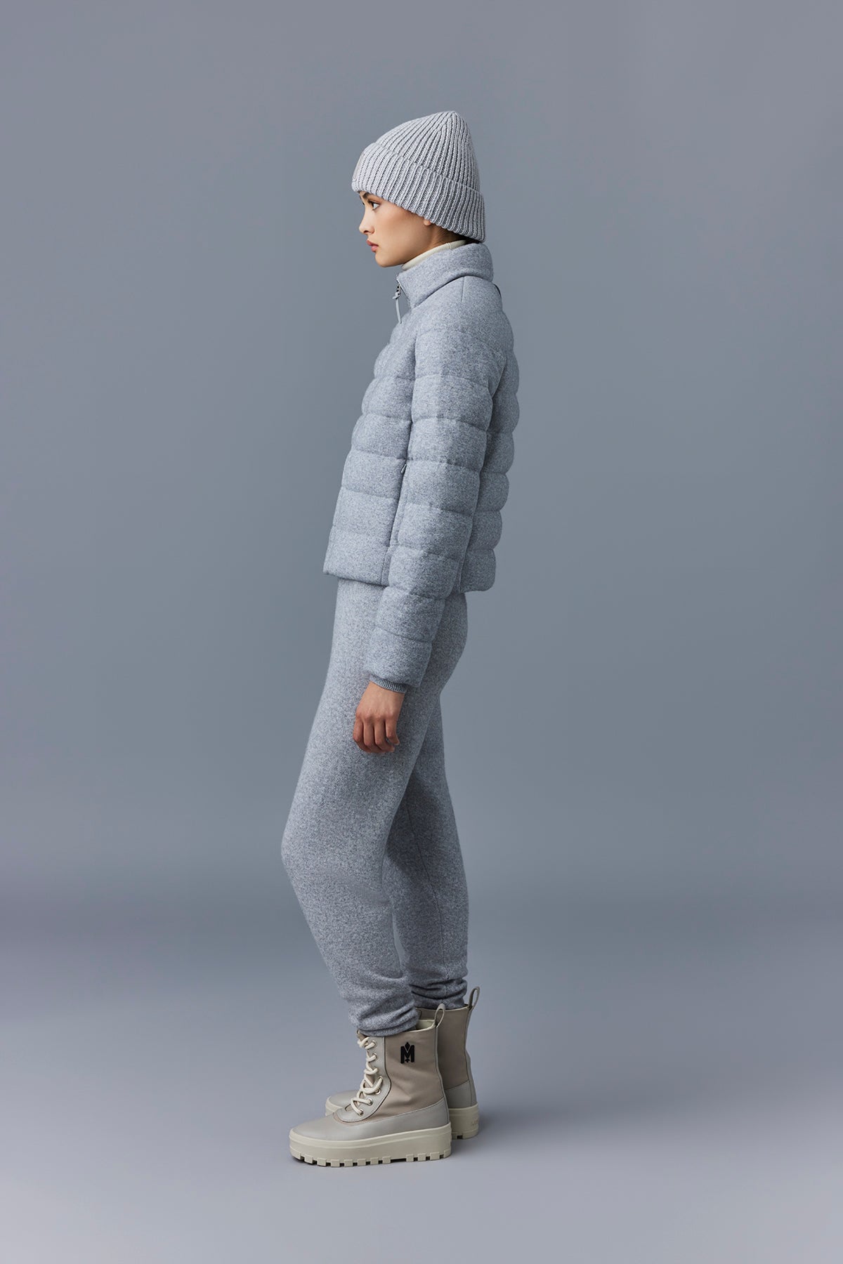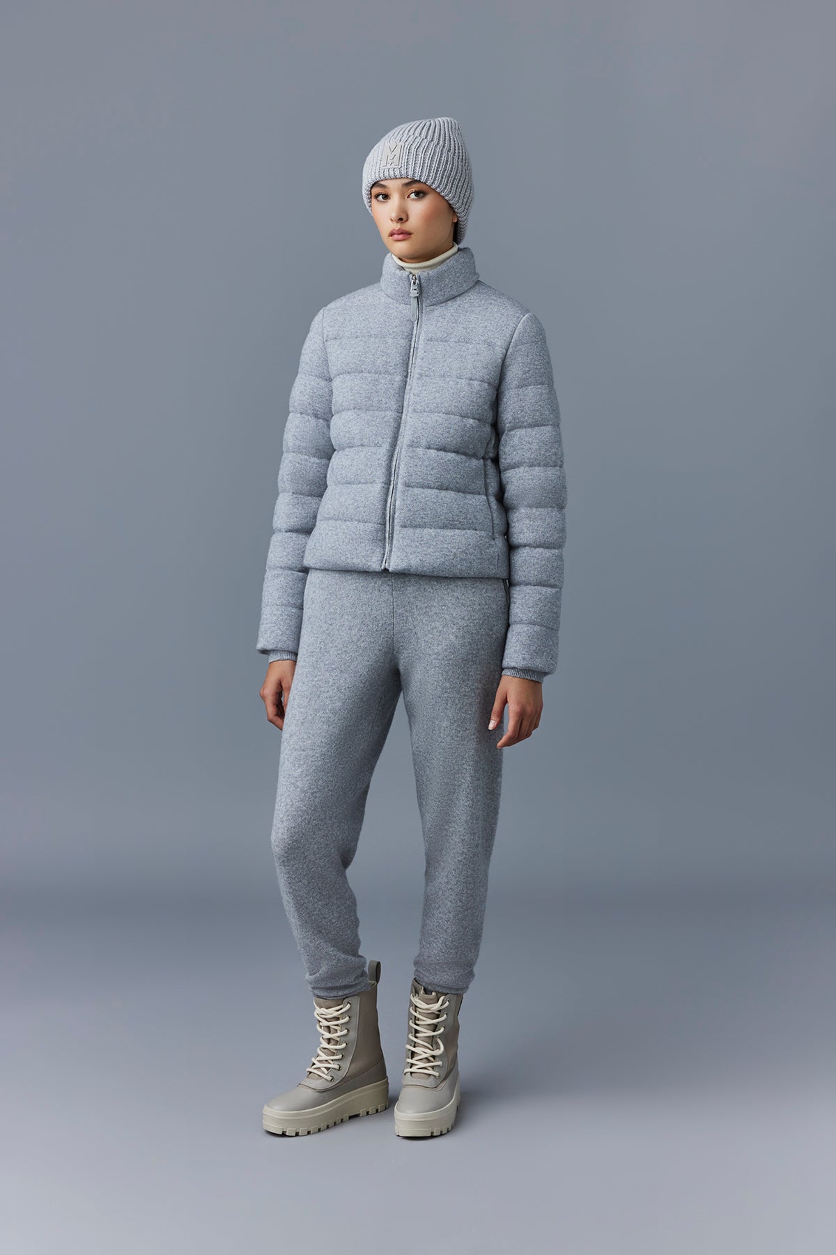 • Extérieur: 65% laine, 35% cachemire. Combo: 58% laine, 28% cachemire, 13% polyester, 1% élasthanne/spandex. Doublure: 100% polyamide/nylon. Garnissage: 90% duvet d'oie, 10% plumes. Déperlant.