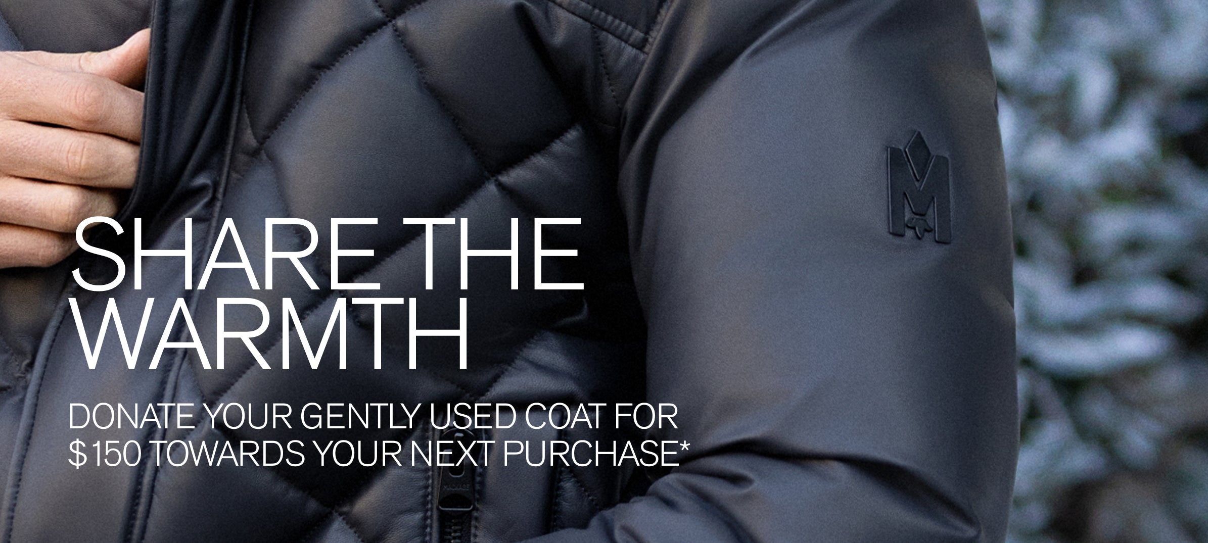 * DONATE A GENTLY WORN COAT BETWEEN OCTOBER 1, 2025, AND OCTOBER 31, 2025, TO RECEIVE $150 OFF A VALID PURCHASE OF $1000 OR MORE BEFORE TAXES. OFFER IS VALID IN PARTICIPATING MACKAGE STORES AND ONLINE AT MACKAGE.COM, MACKAGE.CA, OR MACKAGE.EU FROM OCTOBER 1, 2025, THROUGH DECEMBER 31, 2025. ONE OFFER PER CUSTOMER. OFFER CANNOT BE TRANSFERRED TO ANOTHER PERSON, APPLIED TO PREVIOUS PURCHASES, USED TOWARD THE PURCHASE OF GIFT CARDS, REDEEMED FOR CASH, OR COMBINED WITH ANY OTHER OFFER. TO REDEEM IN STORE, PRESENT THIS EMAIL AT THE REGISTER. TO REDEEM ONLINE, ENTER YOUR UNIQUE CODE AT CHECKOUT. ALL ITEMS ARE FINAL SALE AND CANNOT BE RETURNED OR EXCHANGED. TERMS OF OFFER ARE SUBJECT TO CHANGE.