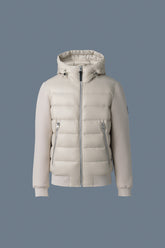 FRANK-R is a mixed-media jacket with an adjustable storm visor hood. The regular-fit bomber silhouette is defined by a recycled lustrous light-down channel quilt front. With indoor-outdoor versatility, the sleeves, shoulders, and back are crafted from a soft double-face jersey. A velvet embroidered signature M adds plush detail.