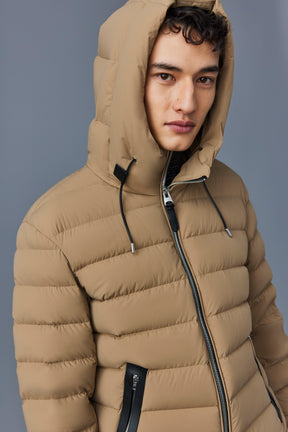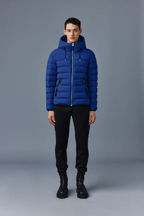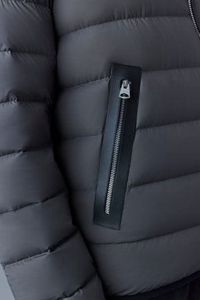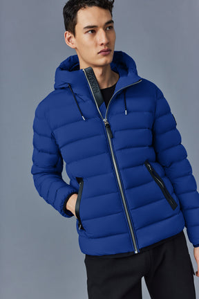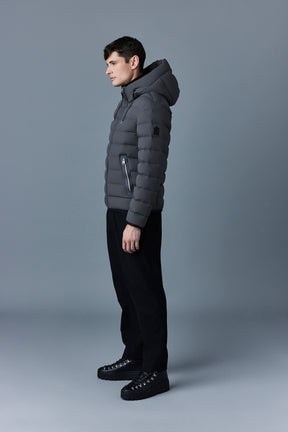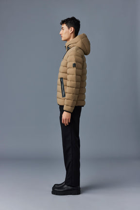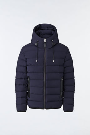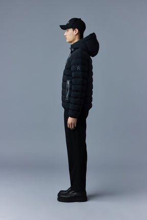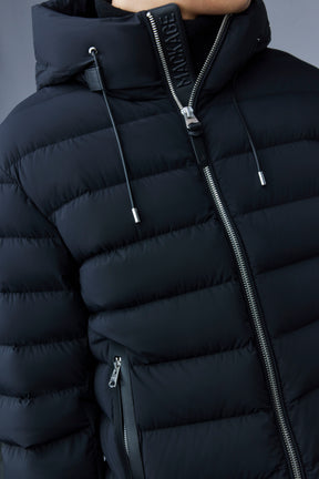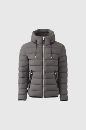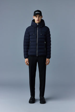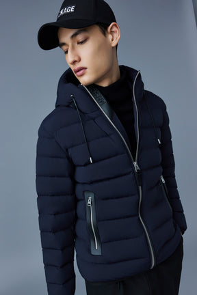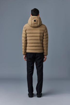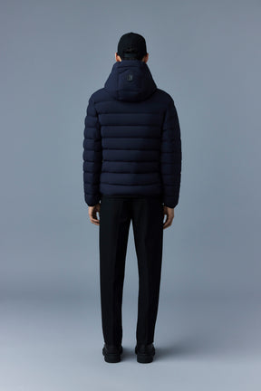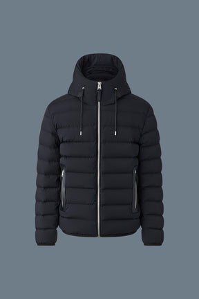 JACK is an AGILE-360 ultra light rcycled down jacket for men featuring an adjustable storm visor hood. Expertly tailored to a regular fit, the 2-way stretch shell offers ease of movement while the elastic trims and drawcord hem enhance the comfortable feel. It is water resistant and repellent, and the centre front zip is accented with edgepainted leather tape. Modern and classic, an effortless staple.
