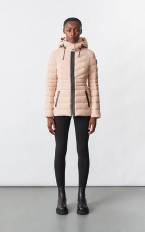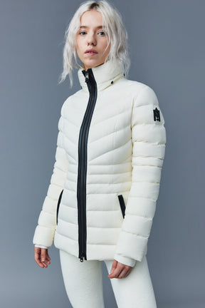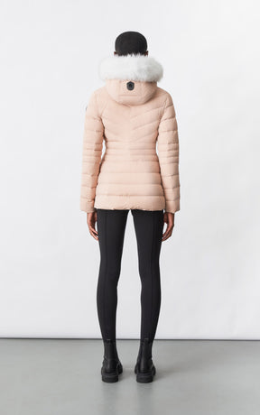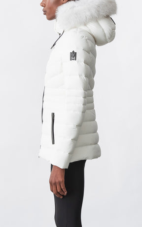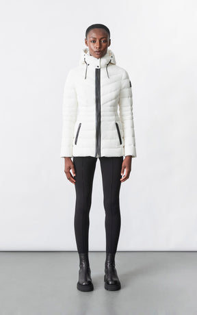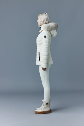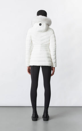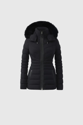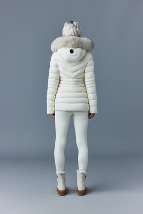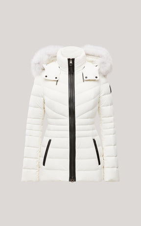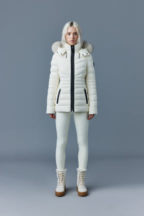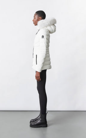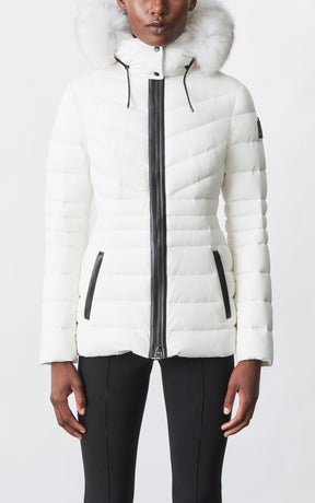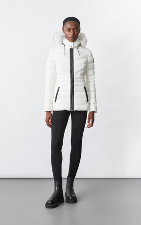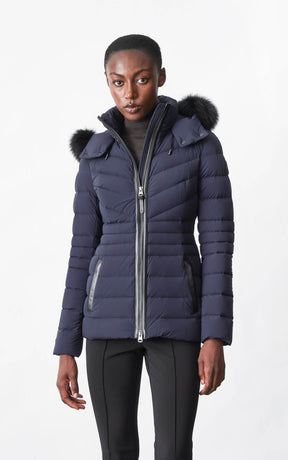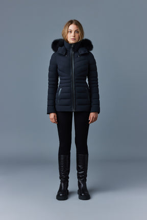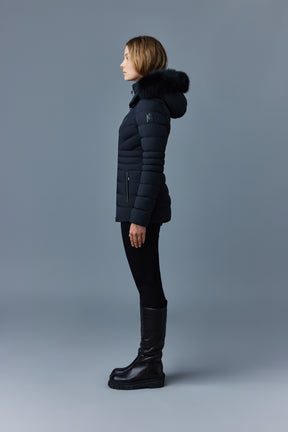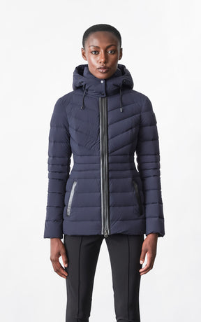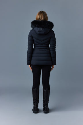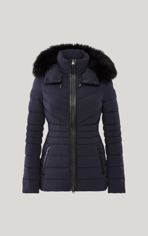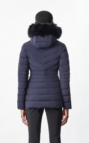 PATSY-BX is a classic mid-length jacket for women meticulously tailored from our proprietary light recycled down and Agile 360 stretch shell. Combining sleek lines with high-performance, the removable hood boasts a plush sustainable blue fox fur trim that can be detached on warmer days. Graphic chevron quilting and sustainable leather detailing accentuate the form-fitting silhouette.